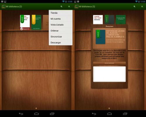 Aquí también nos esperan sorpresas. La Tagus viene con Android 4.0.3 (Ice Cream) y, ya que es un dispositivo propio de la Casa del Libro que busca aportar algo más que un e-reader, viene con el sistema operativo modificado por la empresa. De esta forma encontramos una aplicación propia de la Casa que consiste en tres botones: Biblioteca, Tienda y Eventos. La primera es una aplicación como tal, una aplicación de lectura. Las dos últimas no son más que links a las secciones de la web de la Casa del Libro que corresponden a estos apartados. Por tanto la única que merece la pena analizar es la de la biblioteca.