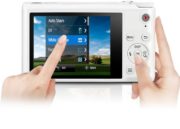 La parte posterior integra la pantalla de 3 pulgadas (460k pixeles) que es táctil además de los tradicionales botones para controla el menú, elegir las modalidades de flash, etc o entrar en la galería además de un botón de acceso directo a grabación de vídeo.