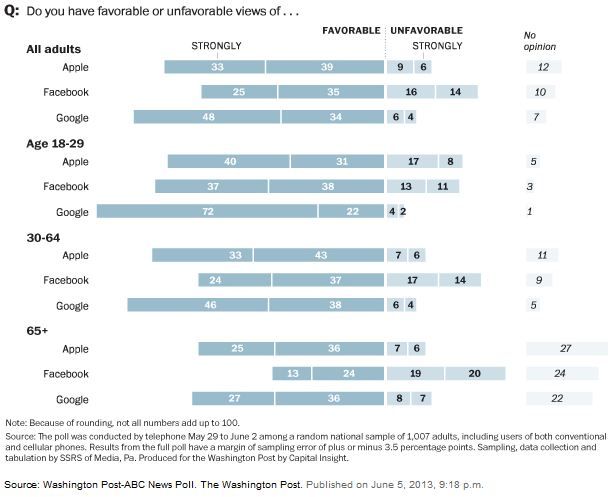 La compañía del androide se mantiene en el lado soleado de la vida: tiene buenos ingresos, estabilidad, un sistema operativo móvil líder y para rematar el aprecio de los usuarios, tal y como pone de manifiesto una reciente encuesta realizada por el Washington Post, en la que se preguntó a personas mayores de 18 años sobre si veían con buenos ojos, o no, a tres gigantes tecnológicos: Google, Apple y Facebook.