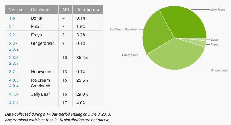 En lo que respecta a los usuarios de Android las cosas son muy diferentes, ya que todavía existe un gran porcentaje de usuarios estancados en Gingerbread, esto es, en Android 2.3. Concretando en números un 36,5 % de los usuarios sigue en dicho sistema operativo, mientras que un 33 % utiliza Jelly Bean.