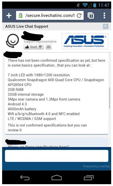 Filtración que no es posible confirmar ya que llega de una supuesta conversación entre un empleado de ASUS y un cliente que pregunta por el ‘K009′, nombre en clave del segundo Nexus 7.