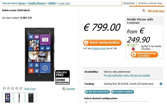 El precio de venta libre del Nokia Lumia 1020 puede batir todos los récords en el sector del smartphone si atendemos a los precios de reserva en Europa que han publicado retailers alemanes.