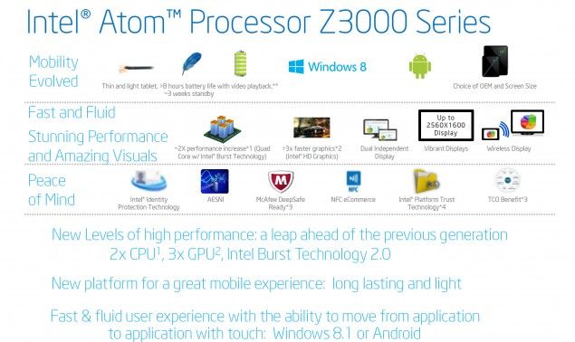 Los Intel Atom Z3000 estarán fabricados en procesos tecnológicos de 22 nanómetros lo que reducirá el consumo y tamaño de un SoC que además de duplicar el número de núcleos físicos (primeros Atom con cuatro núcleos) tendrán una frecuencia destacada de hasta 2,4 GHz, para un aumento de rendimiento de procesamiento estimado entre el 50-60 por ciento sobre la generración actual.