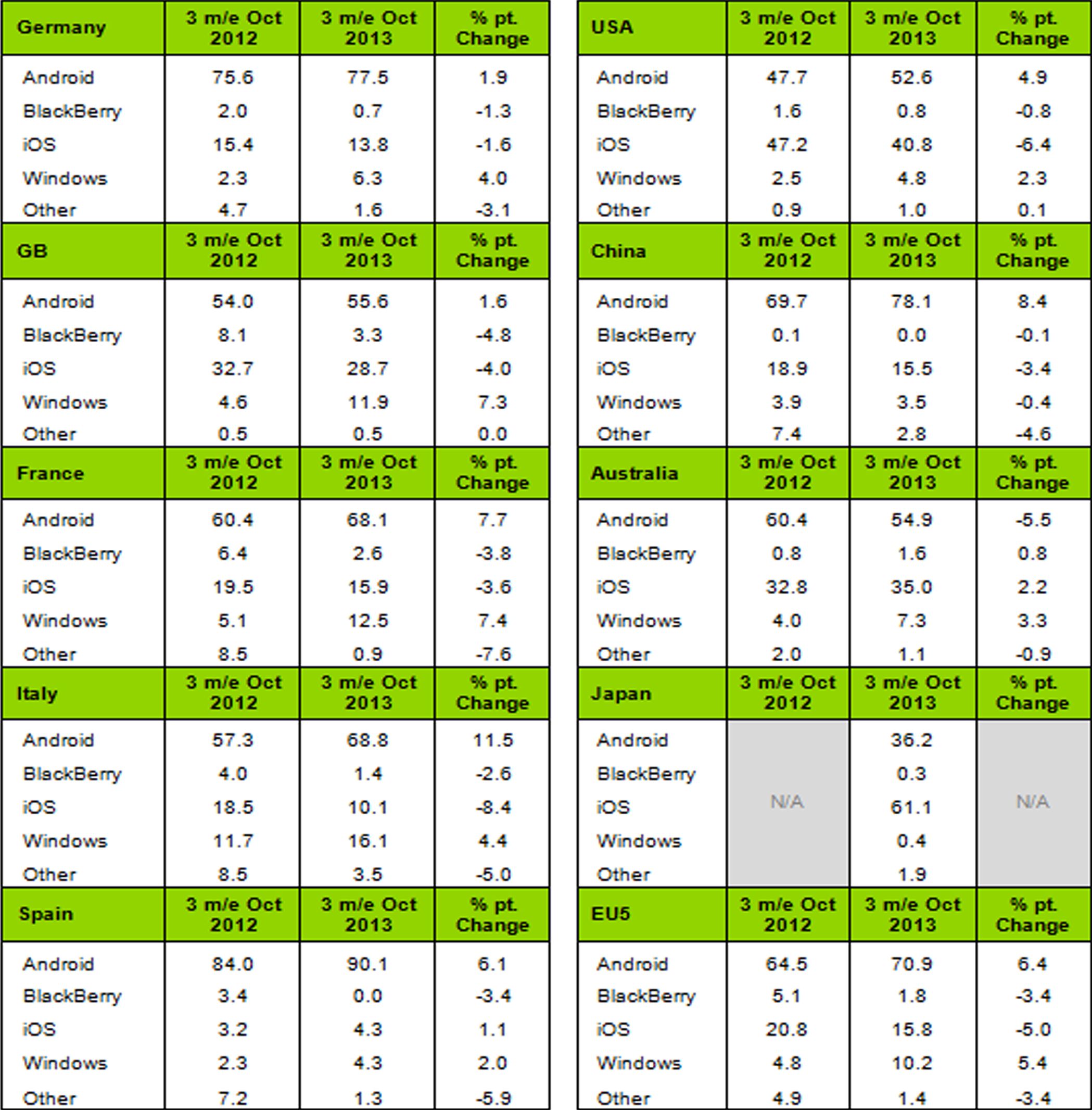 Echando un ojo más a fondo a los resultados también podemos apreciar que Windows Phone se acerca peligrosamente a iOS en otros países, como por ejemplo Francia, donde la distancia entre uno y otro es cada vez menor.