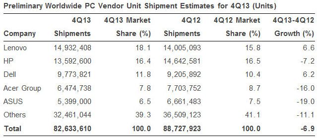 A destacar los datos de Lenovo, la única de las grandes compañías que aumentó ventas en 2013 lo que le permite encabezar el mercado PC con el 16,9 por ciento de cuota seguida muy de cerca por HP con el 16,2 por ciento.