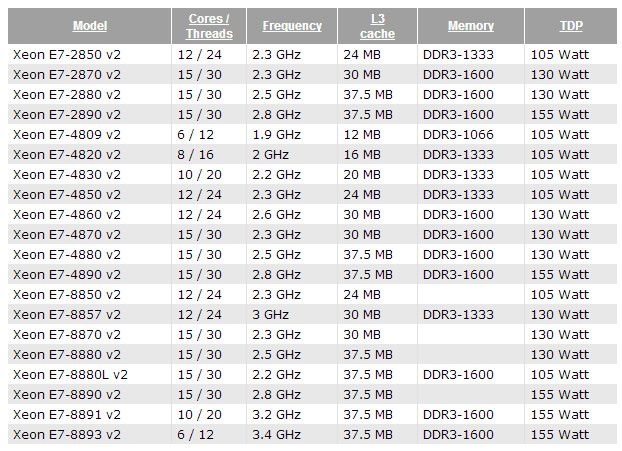Destinados a servidores de alto rendimiento, el listado contempla 21 modelos diferentes con un Xeon E7-8890 V2 como tope de gama. Un desarrollo impresionante con los 15 núcleos mencionados a 2,8 GHz y un TDP de 155 vatios. Con soporte para placas de ocho sockets nos encontraríamos con una solución de 120 núcleos físicos. Casi nada, aunque se rumorea que el precio de uno de estos Xeon alcanzaría los 5.000 dólares.