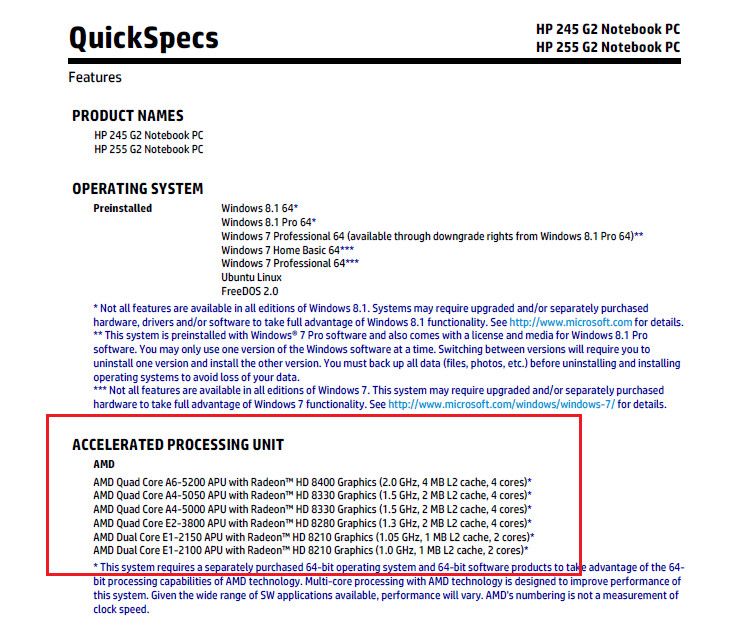 - A4-5050: CPU de cuatro núcleos a 1,55 GHz con 2 MB de caché L2 y Radeon HD 8330 (128 procesadores de flujo GCN a 500 MHz).