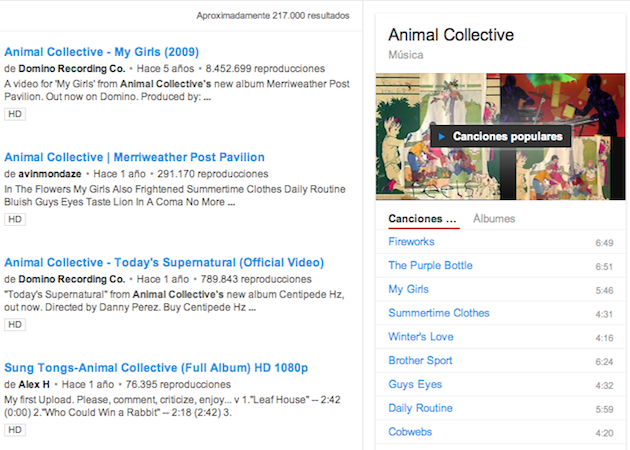 Sabiendo que muchos recurren al popular portal de videos para escuchar música, hoy debuta una nueva característica: al introducir un intérprete en el cuadro de búsqueda, a la derecha de los resultados aparece información sobre sus temas y álbumes completos, con enlaces a otros vídeos y a su discografía ordenada por fecha.