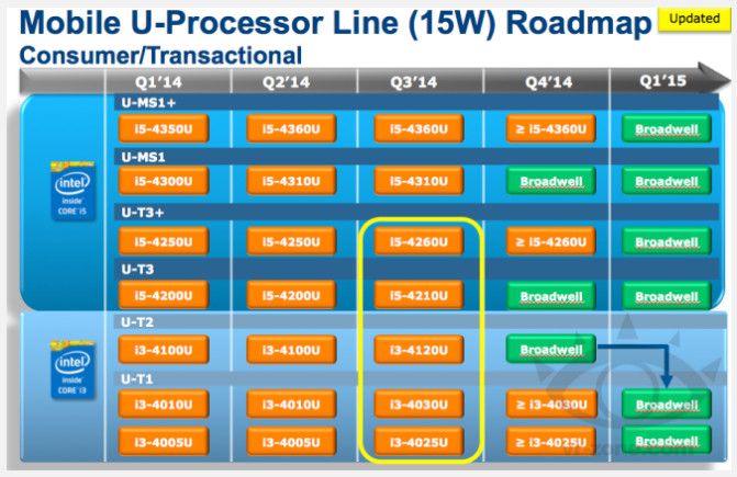 El último roadmap filtrado revela una decena de nuevos modelos de la serie ‘U’, como los actuales fabricados en procesos tecnológicos de 22 nanómetros usando formatos BGA y en dos variantes con TDP de 15 vatios Core i3-4025U, Core i3-4030U, Core i3-4120U, Core i5-4210U y Core i5-4260U, y los de TDP 28 vatios como el Core i7-4558U, Core i5-4288U, Core i5-4258U y Core i3-4158: