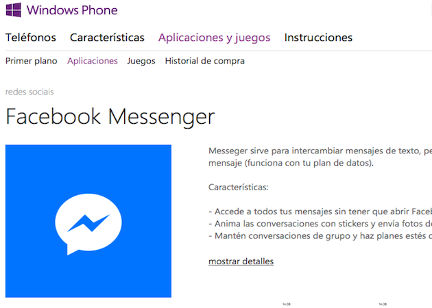 La aplicación, que debuta con la versión 3.0.12.0 y pesa solo 4 Mbytes, está disponible para descargar sin coste alguno en http://www.windowsphone.com/es-es/store/app/facebook-messenger/3219d30d-4a23-4f58-a91c-c44b04e6a0c7.
