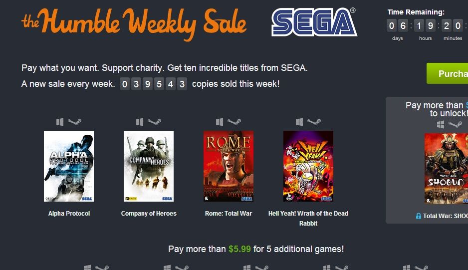 Si decidimos pagar 6 dólares o más, unos 4,3 euros, nos llevaremos, además de los cuatro títulos citados, los juegos The Typing of the Dead: Overkill, Binary Domain, Renegade Ops, diez clásicos de Megadrive y Medieval II: Total War.