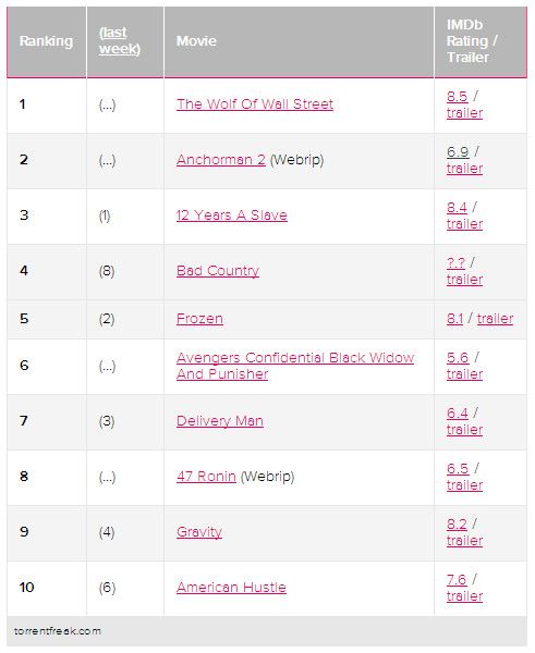 TorrentFreak ha publicado la lista semanal de las películas más ‘compartidas’ (vale, pirateadas) en la red BitTorrent, encabezada por ‘El Lobo de Wall Street’.