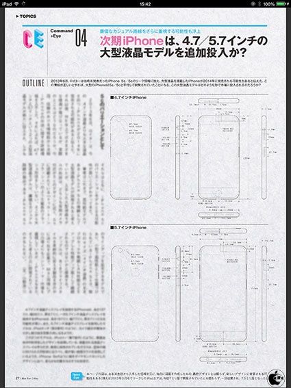 La documentación que acompaña a las fotografías confirmarían el desarrollo de dos versiones con tamaños de pantalla de 4,7 y 5,5 pulgadas de diagonal. Este último, un phablet en toda regla, tendría una resolución WQHD (2560 por 1440 píxeles) lo que permitirá al iPhone 6 una densidad de píxeles de 538 ppi.