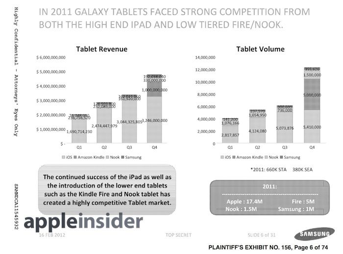 Según dicho documento a finales de 2012 Samsung había vendido sólo 1 millón de tablets, mientras que a dicha fecha Apple había vendido 17,5 millones de iPads. Por su parte Nook alcanzó los 1,5 millones de unidades vendidas, y la Kindle Fire de Amazon llegó a los 5 millones.