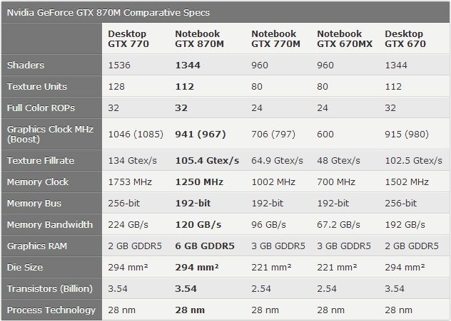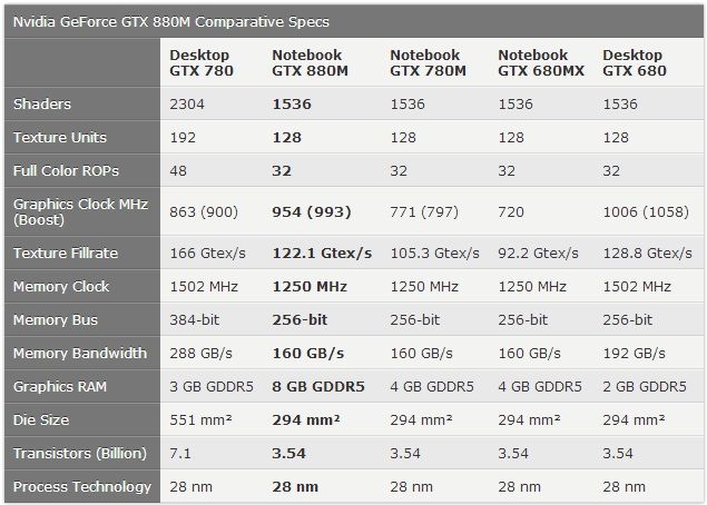 Una GPU interesante, ya que se asemeja a una GTX 760 de sobremesa, pero sacrifica el bus de 256 bits por uno de 128 bits, como podemos ver en la tabla.