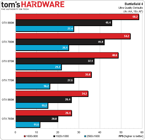 Finalmente la GTX 860M puede sin problemas con Battlefield 4 a 1.600 x 900 en Ultra, pero no es capaz de llegar a 30 FPS en dicha resolución y calidad alta en Metro Last Light.
