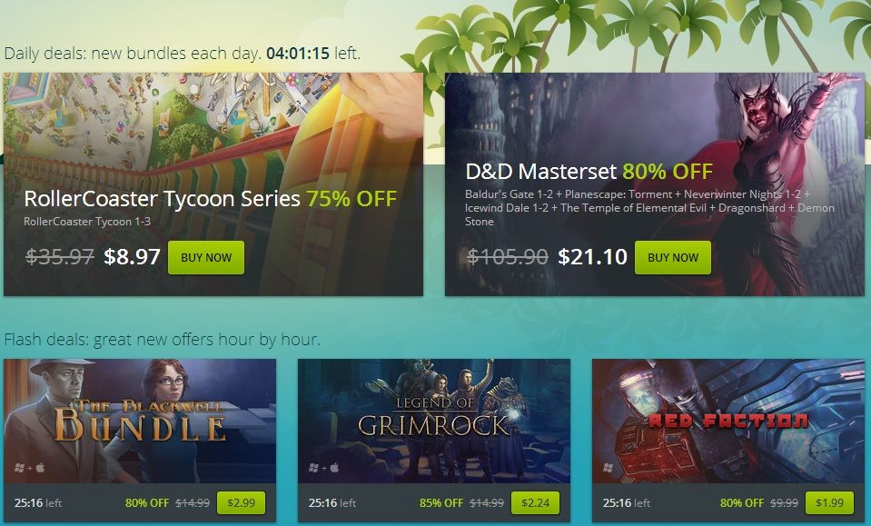 Siguiendo además los pasos de la conocida plataforma de distribución digital de Valve en GoG también encontraremos packs de géneros diversos con diferentes juegos y descuentos de hasta el 90%, que irán cambiando en ciclos de 24 horas, así que os aconsejamos estar atentos para no perderos algo que os pueda interesar.