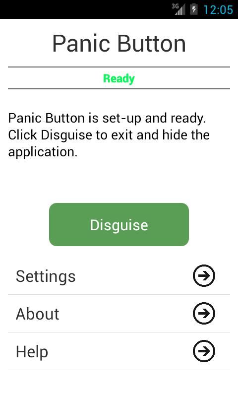 Panic Button consiste en crear una red formada por contactos de confianza a los que poder avisar rápida y discretamente en caso de peligro, por ejemplo, enviando datos de la localización. Utiliza SMS para las labores de comunicación, por lo que se deberá tener crédito en el teléfono. Una vez configurada, la aplicación se hace pasar por una calculadora.