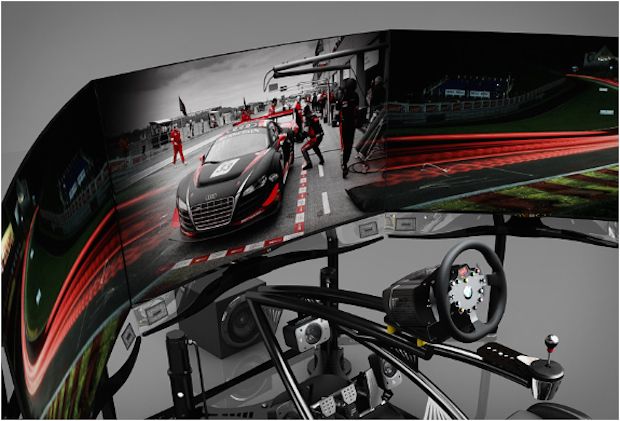 El kit que véis en las imágenes y el vídeo que acompaña a estas líneas está compuesto por tres pantallas LG OLED de 55 pulgadas sin bordes, que ofrecen una superficie de visionado panorámica de 165 pulgadas. El hardware está compuesto por un PC de altas prestaciones donde dos gráficas AMD Radeon HD7990 se encargarán de mover cualquier videojuego con la máxima fluidez posible.