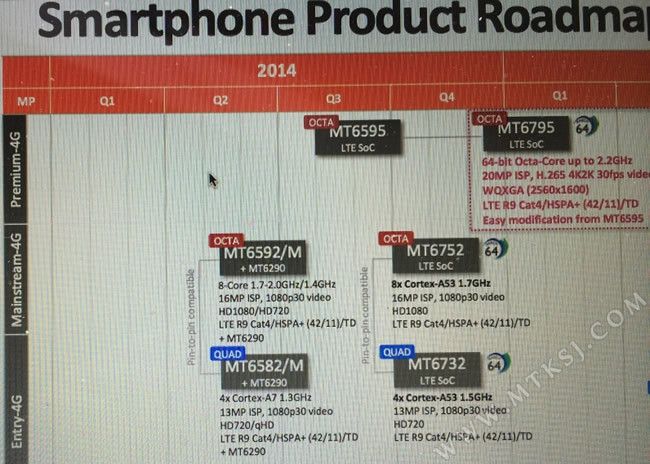 Mediatek, que junto a Qualcomm monopoliza la fabricación mundial de SoCs para dispositivos móviles, también está por la tarea y una diapositiva filtrada muestra tres SoC de 64 bits de próximo lanzamiento.