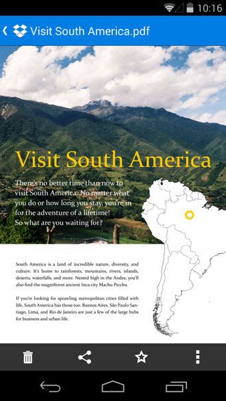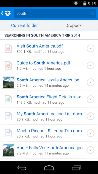 La previsualización de documentos permite ahora ver, navegar y hacer zoom en documentos de Word, PowerPoint y ficheros PDF, directamente sobre Dropbox y sin tener que enlazar a otra aplicación externa en Android. Las búsquedas han mejorado incluyendo la posibilidad de buscar en carpetas específicas en todo el árbol de directorios de nuestra cuenta de Dropbox, almacenando en un historial las que hagamos para luego sugerirlas más adelante. También marca los textos que se ajusten a las búsquedas realizadas en el nombre de los ficheros.