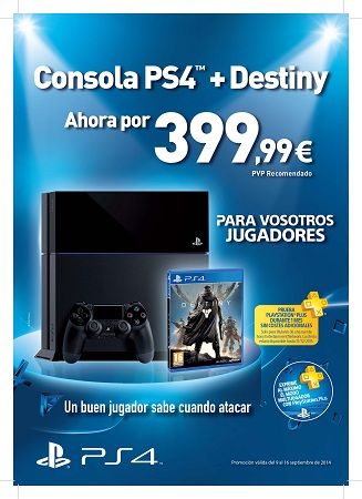 Volviendo al pack incluye, obviamente, la consola [pajarito]PS4 en color blanco o negro[/pajarito] y el juego Destiny, todo por un precio de 399 euros, IVA incluido, sin duda una ganga ya que viene a ser como llevarnos el juego totalmente gratis.