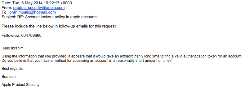 En dicho correo Balic contaba a Apple que [pajarito]iCloud era susceptible de sufrir ataques de fuerza bruta[/pajarito], ya que él mismo fue capaz de probar 20.474 contraseñas diferentes en una sola cuenta del servicio de almacenamiento en la nube de los de Cupertino sin que lo detuviera medida de seguridad alguna.