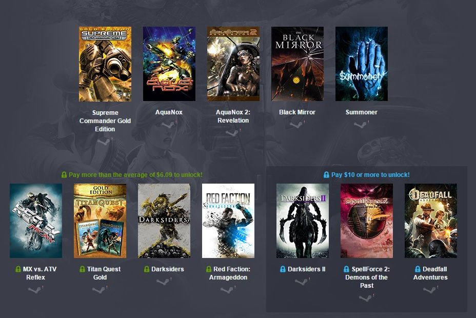 Si por el contrario pagamos más de 6,09 dólares nos llevaremos también MX vs. ATV Reflex, Titan Quest Gold, Darksiders y Red Faction: Armageddon. Finalmente si subimos nuestra compra hasta los 10 dólares nos haremos también con tres joyas: Darksiders II, Spellforce 2: Demons of the Past y Deadfall Adventures.