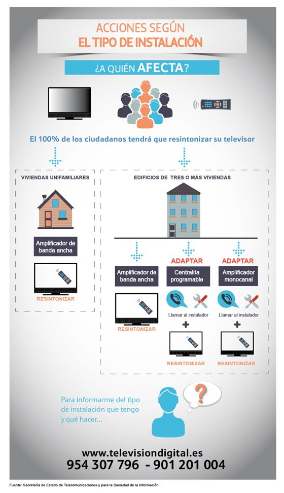 El cambio es global y afecta a toda Europa, unos doce millones de hogares en España. El usuario individual sólo tiene que resintonizar los canales desde el televisor o su mando a distancia en el plazo mencionado, desde el 26 de octubre al 31 de diciembre. Obviamente, no hay que cambiar ni los televisores ni los sintonizadores TDT. Si tu televisor es de las últimas generaciones es probable que te salte un aviso recordándote las nuevas frecuencias. La resintonización habrá que realizarla en todos los televisores del hogar. En cualquier caso, un cambio sencillo ya que en viviendas unifamiliares con antena individual eso será todo lo que haya que hacer.