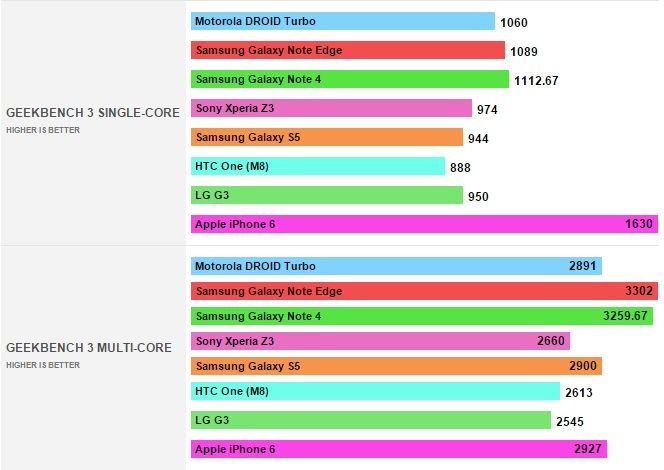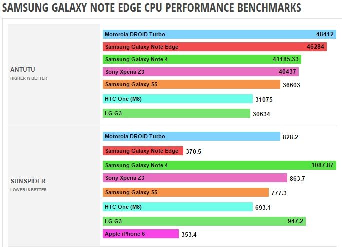 Vistas dichas especificaciones era predecible que sería capaz de ofrecer un nivel de rendimiento en la CPU realmente elevado, y como podemos ver en las gráficas que acompañan a la noticia así es, aunque lo cierto es que los resultados están bastante repartidos entre el Galaxy Note Edge, el Galaxy Note 4 y el Motorola DROID Turbo.