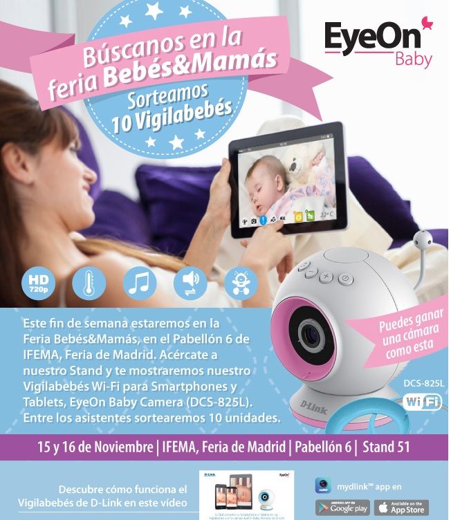 D-Link ha anunciado que acudirá a la IFEMA (Feria de Madrid), donde sortearán 10 vigilabebés EyeOn Baby Camera (DCS-825L), un producto muy interesante sobre el que ya os hemos hablado anteriormente.