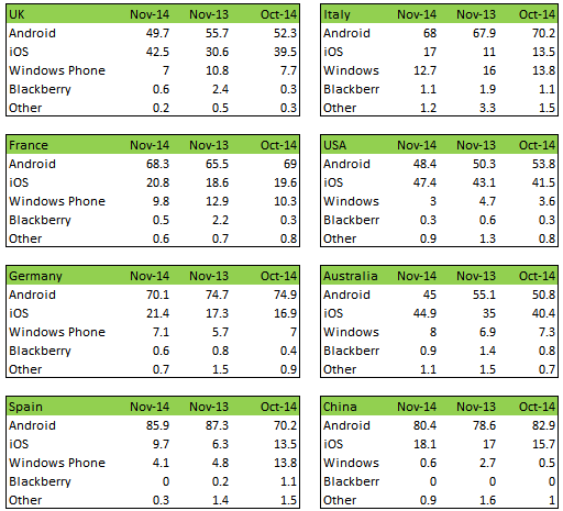 La consultora Kantar Worldpanel ha publicado una información en la que podemos ver la cuota de mercado a nivel mundial de Android, iOS, Windows Phone y BlackBerry a nivel mundial durante los meses de octubre y noviembre de 2014, y la misma nos deja detalles muy interesantes.