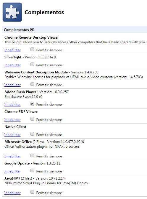 De forma predeterminada, al instalar Google Chrome, muchos plug-in innecesarios se instalan y se activan. Algunos de ellos ayudan a mostrar contenido como Flash, Java, Silverlight, o archivos de Windows Media, pero la mayoría de ellos no son importantes para tu navegación diaria. Los complementos pueden ralentizar el rendimiento de Chrome pero se pueden desactivar los que no necesites.