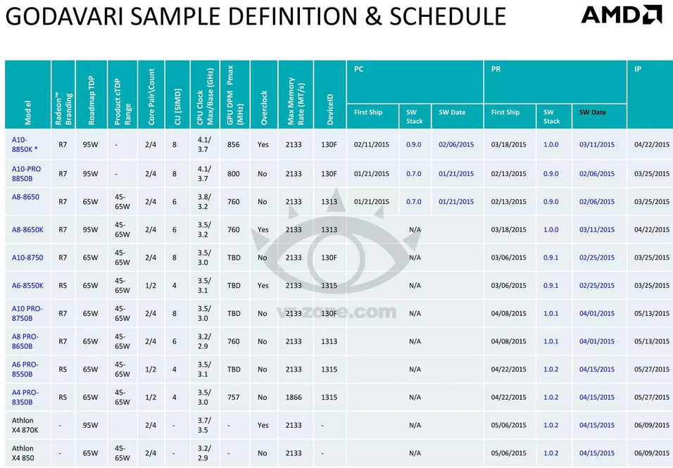 Las APU Godavari incluyen una decena de modelos (A10, A8, A6 y A4) y se comercializarán en el próximo trimestre según la diapositiva filtrada por VR-Zone. Todas con CPU, GPU y controladora de memoria integrada, incluyendo núcleos Steamroller, gráfica Radeon y soporte a memorias DDR3.