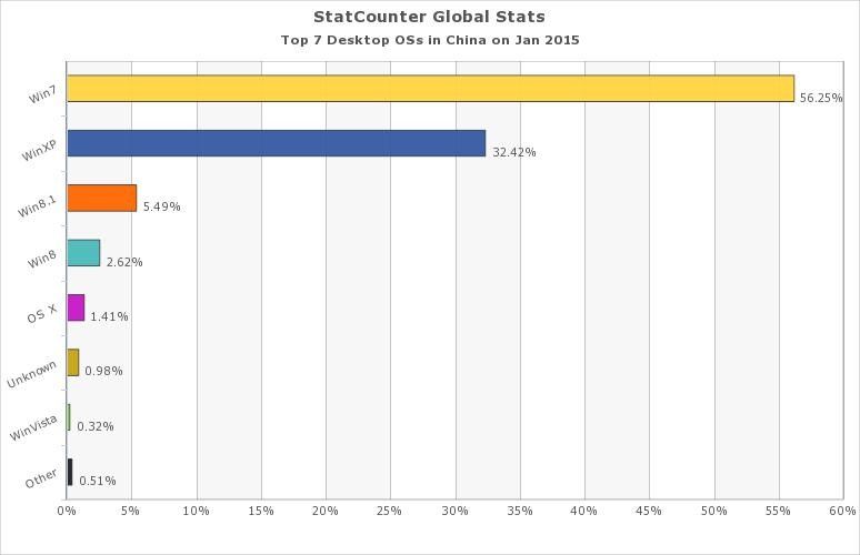 Ninguna medida parece haber dado resultado. El 97 por ciento de las computadoras en China corren Windows según los datos de StatCounter, con Windows 7 al frente con un 56 por ciento y Windows XP que conserva un enorme 32 por ciento, con restos para Windows 8 y 8.1.