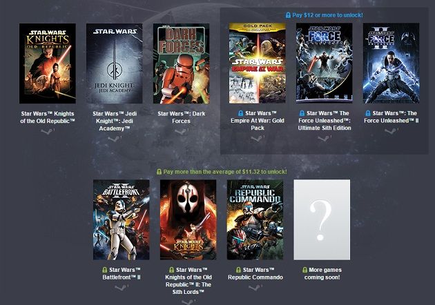 Si pagamos más de 11,32 dólares nos haremos también con los juegos Star Wars: Battlefront II, Star Wars KOTOR II: The Sith Lords y Star Wars: Republic Commando, aunque teniendo en cuenta la escasa diferencia de precio sale más a cuenta pagar 12 dólares, ya que por esa cantidad nos llevaremos también Star Wars Epire at War: Gold Pack, Star Wars The Force Unleashed: Ultimate Sith Edition y Star Wars The Force Unleashed II.