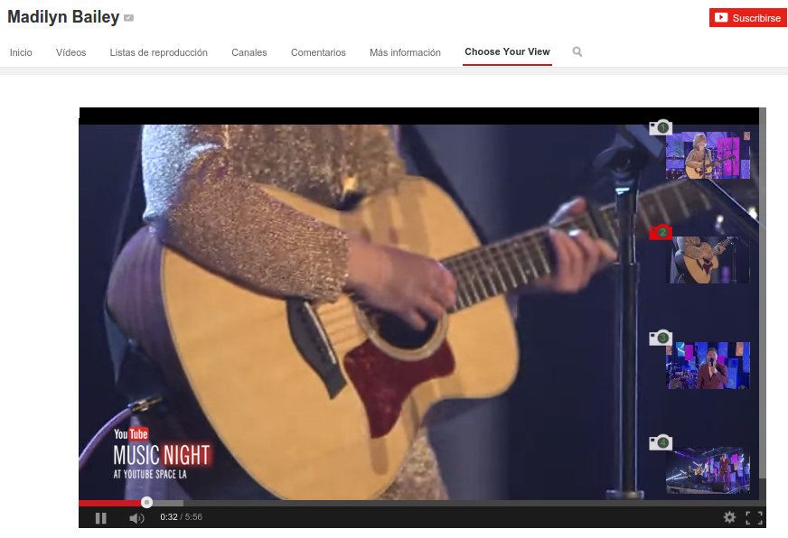 Como se puede apreciar en la imagen, en la parte derecha de la reproducción se pueden ver cuatro miniaturas numeradas con unas cámaras, que representan los distintos ángulos en los que se pueden ver este vídeo de Madilyn Bailey, una cantante que bastante famosa en YouTube.