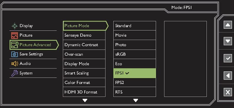 Los usuarios que no quieran complicarse tanto encontrarán predefinidos un par de modos para FPS, que mejoran el tiempo de respuesta y eliminan las estelas para que ganemos precisión y uno para RTS, más orientado a lo visual que al rendimiento. Se pueden guardar hasta tres perfiles personalizados y cambiar de uno a otro pulsando un botón del S-Swich (el controlado externo antes mencionado) o directametne desde el menú OSD.