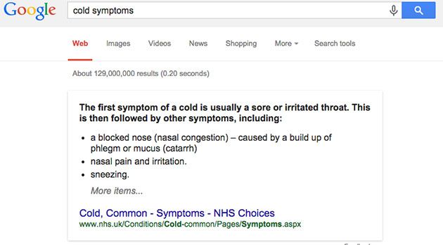 Aunque el experimento con Google Health no terminó de salir bien, la salud es un campo muy importante para las empresas de Internet. Desde hace unas horas (y por el momento solo disponible en las versiones del buscador de EE.UU. y Reino Unido) al teclear palabras clave como «cold symptoms», «abdominal pain» o «anxiety» nos aparece un cuadro en la primera posición de la lista con información y un enlace directo al Servicio Nacional de Salud (NHS). Cada resultado ha sido revisado por un equipo de especialistas de Google y cuenta con la colaboración de profesionales de la Clínica Mayo.