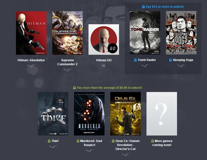 Echando un ojo concreto a este pack tenemos el planteamiento habitual. Si pagamos un dólar o más nos llevamos los juegos Hitman: Absolution, Supreme Commander 2, y Hitman GO en su versión para Android.