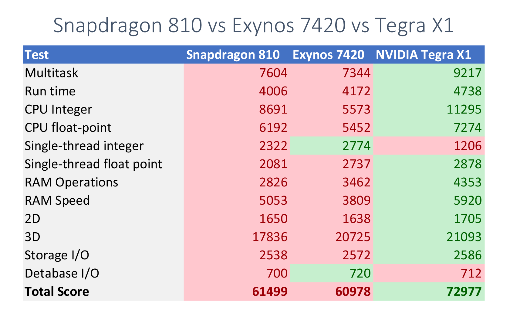 Con estos mimbres, los primeros resultados que nos llegan de benchmark como AnTuTu la sitúa a la cabeza del mercado en rendimiento, comparado con el Snapdragon 810 de Qualcomm y el Exynos 7420 de Samsung.