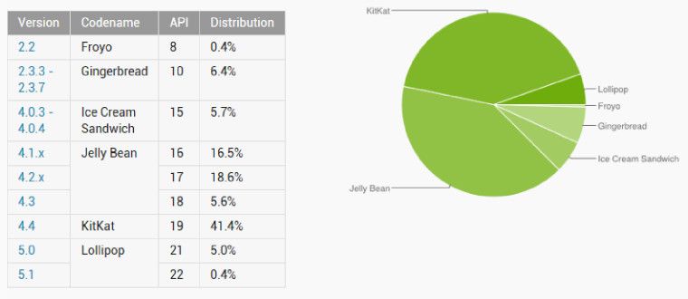 Por su parte Lollipop llega al 5%, mientras que Jelly Bean ha cedido el liderato a KitKat, registrando ambas una cuota total del 40,7% y 41,4%, respectivamente.