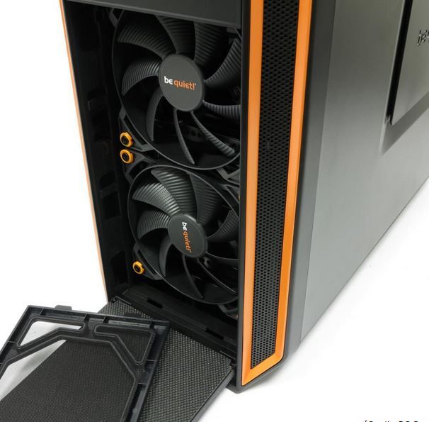 El discreto frontal oculta dos tapas (con capa asilante en el interior) que dan acceso a las cuatro bahías de 5,25″ (una más de lo habitual en este formato) y dos ventiradores Pure Wings 2 de 14 cm., protegidos por un filtro antipolvo extraíble y lavable; la función de estos elementos es generar un flujo de aire continuo que garantice la correcta refrigeración que lleva un PC de alta gama.