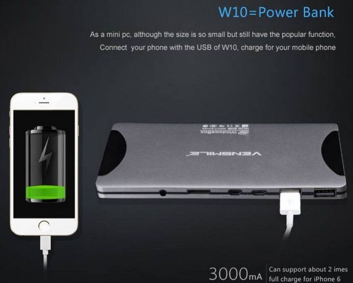 Frente al formato pendrive del dispositivo de Intel, Vensmile W10 tiene un tamaño similar a un phablet (15 x 8 x 1 cm) y cuenta con una batería de 3000 mAh incorporada que le permite recargar pequeños dispositivos como móviles inteligentes.