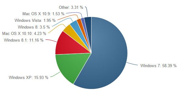 Los OS X de Apple mantienen posiciones con cuotas entre el 8 y el 9 por ciento, destacando la versión 10.10 con la mitad de usuarios. Los usuarios de Apple frente a los de Windows, sí están pasando mayoritariamente a la última versión. Linux tendría el 1,52 por ciento del escritorio según los datos de NetMarketShare.