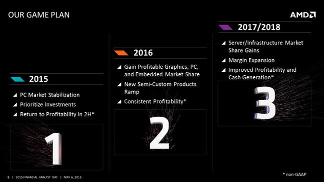 La CEO de AMD, Lisa Su, ha celebrado una conferencia con inversores en la que ha presentado su estrategia para remontar negocio, prometiendo volver a los números verdes en el segundo semestre de 2015, a una rentabilidad sostenida a partir de 2016 y con una hoja de ruta que incluye una nueva cartera de producto sumamente interesante.