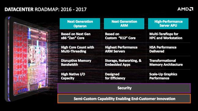 La CEO de AMD también ha confirmado nueva generación de procesadores bajo arquitectura ARM, con núcleos «K12» diseñados por la firma. Estarán destinados al mercado de servidores al igual que nuevos Opteron basados en núcleos Zen. No se ha informado si AMD utilizará la arquitectura ARM en PCs. Un rumor insistente en los últimos años.