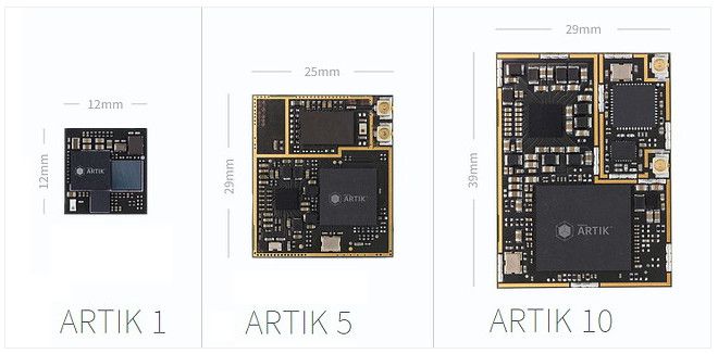 La propuesta inicial se compone de tres módulos completos de hardware (Artik 1, 5 y 10) que incluyen CPU, GPU, memoria, almacenamiento, sensores, soporte para estándares inalámbricos y chips para decodificación de vídeo.