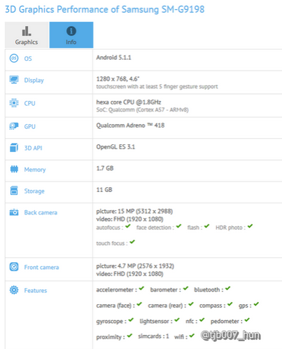 Según esta información el Galaxy S6 Mini contaría con un SoC Snapdragon 808 con CPU de 64 bits y seis núcleos, 2 GB de RAM, pantalla de 4,6 pulgadas con resolución 720p, 16 GB de almacenamiento, cámara trasera de 16 MP, frontal de 5 MP y Android 5.1.1.