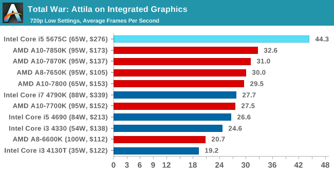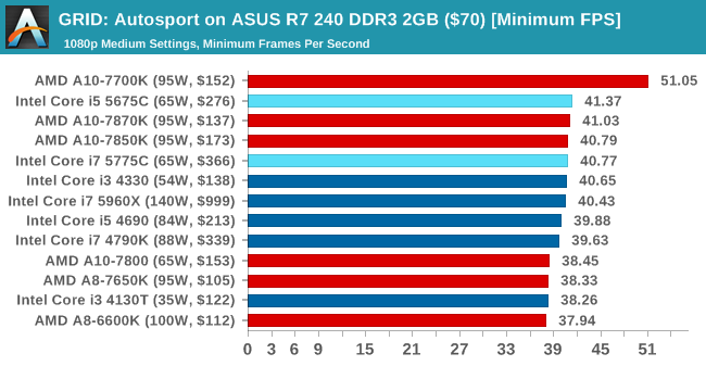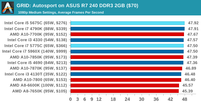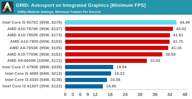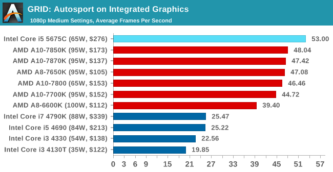 En GRID podemos llegar a 1080p y calidad media manteniendo 53 FPS de media, mientras que la APU más potente de AMD no pasa de los 48 FPS.